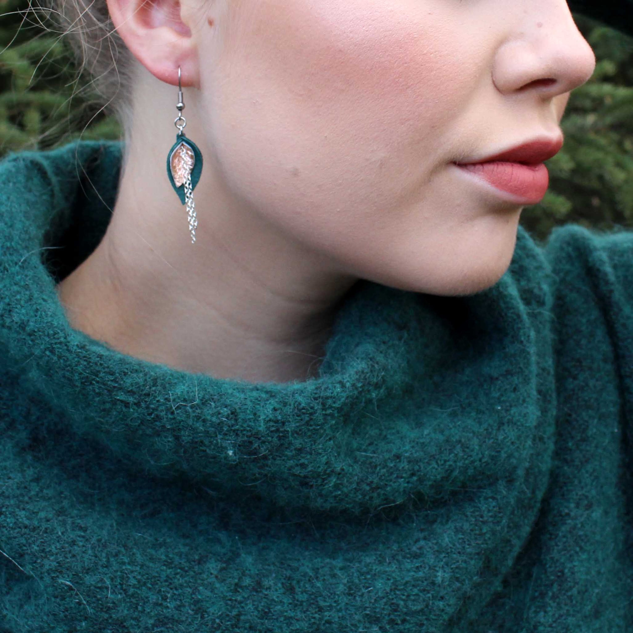 Bloom -malliston korvakorut koossa mini, joiden väriyhdistelmä on metsänvihreä ja ruusukulta.