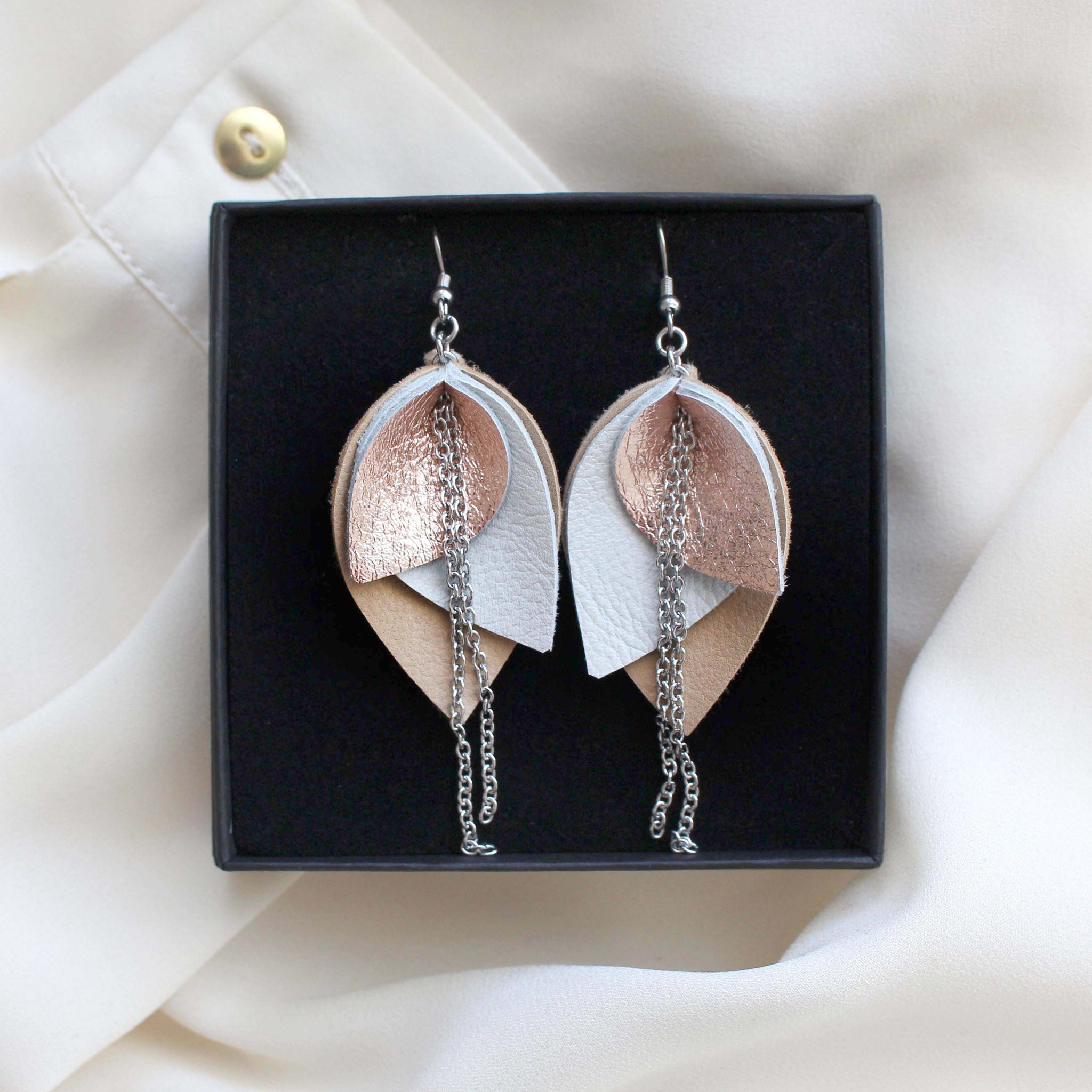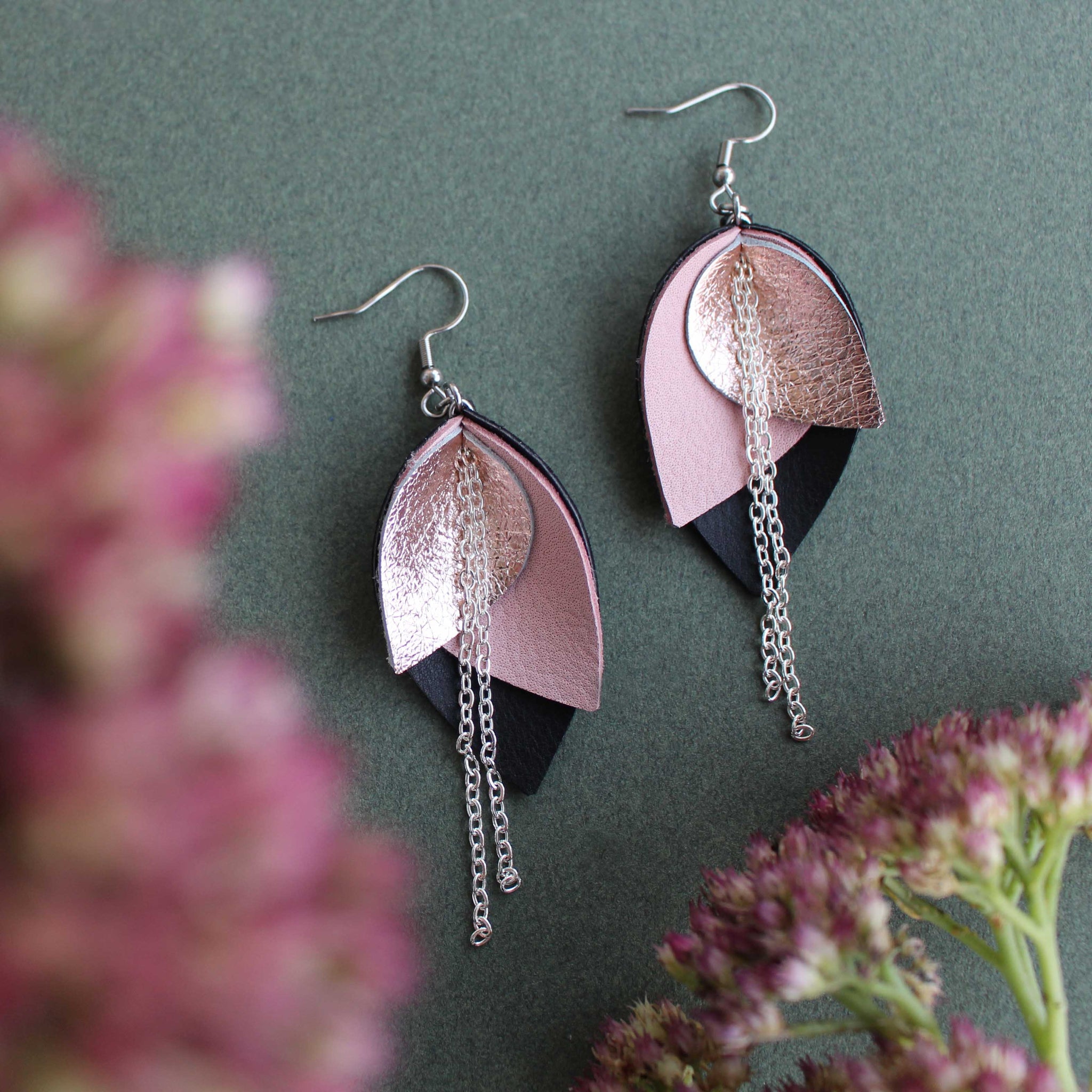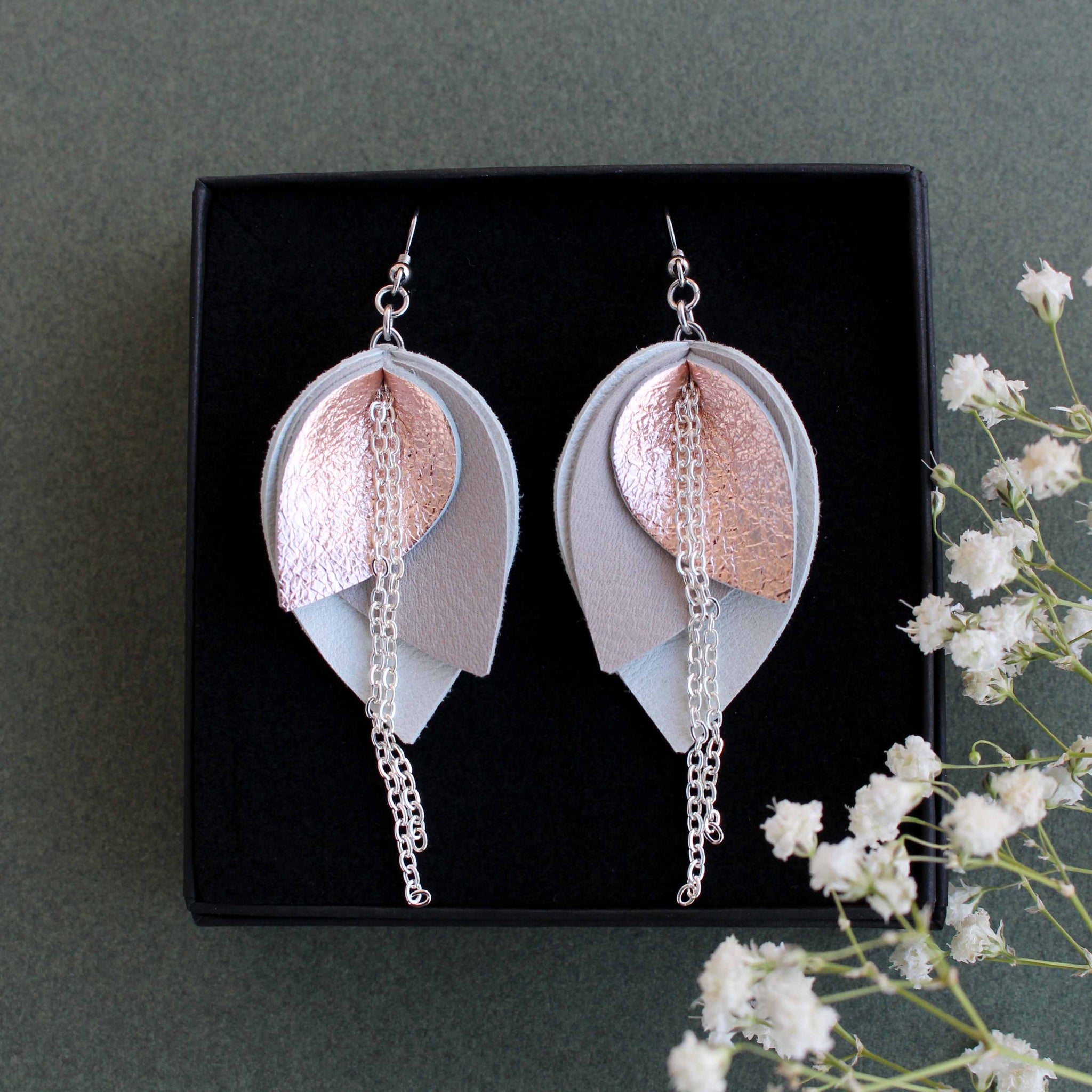 Iso Bloom-korvakoru koostuu kolmesta väristä: kahdesta pääväristä ja metallipintaisesta nahasta, joka on joko hopea tai ruusukulta.