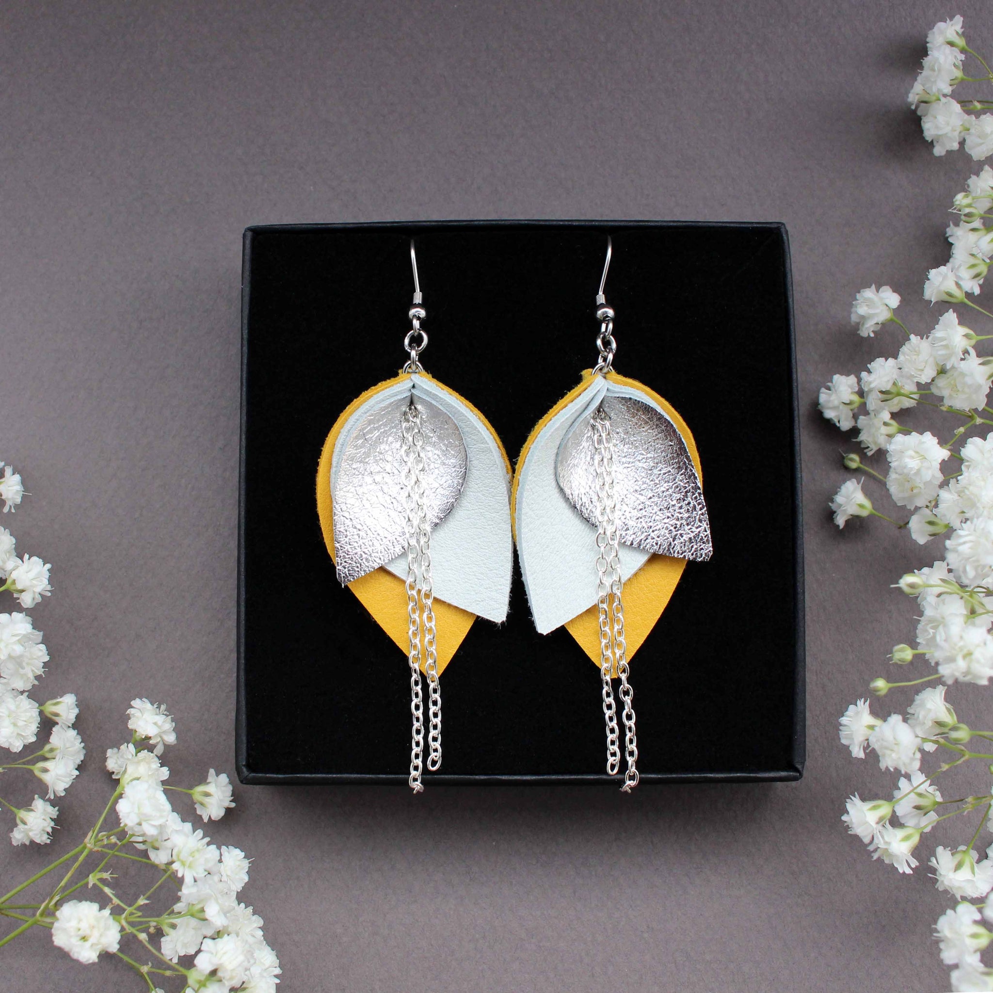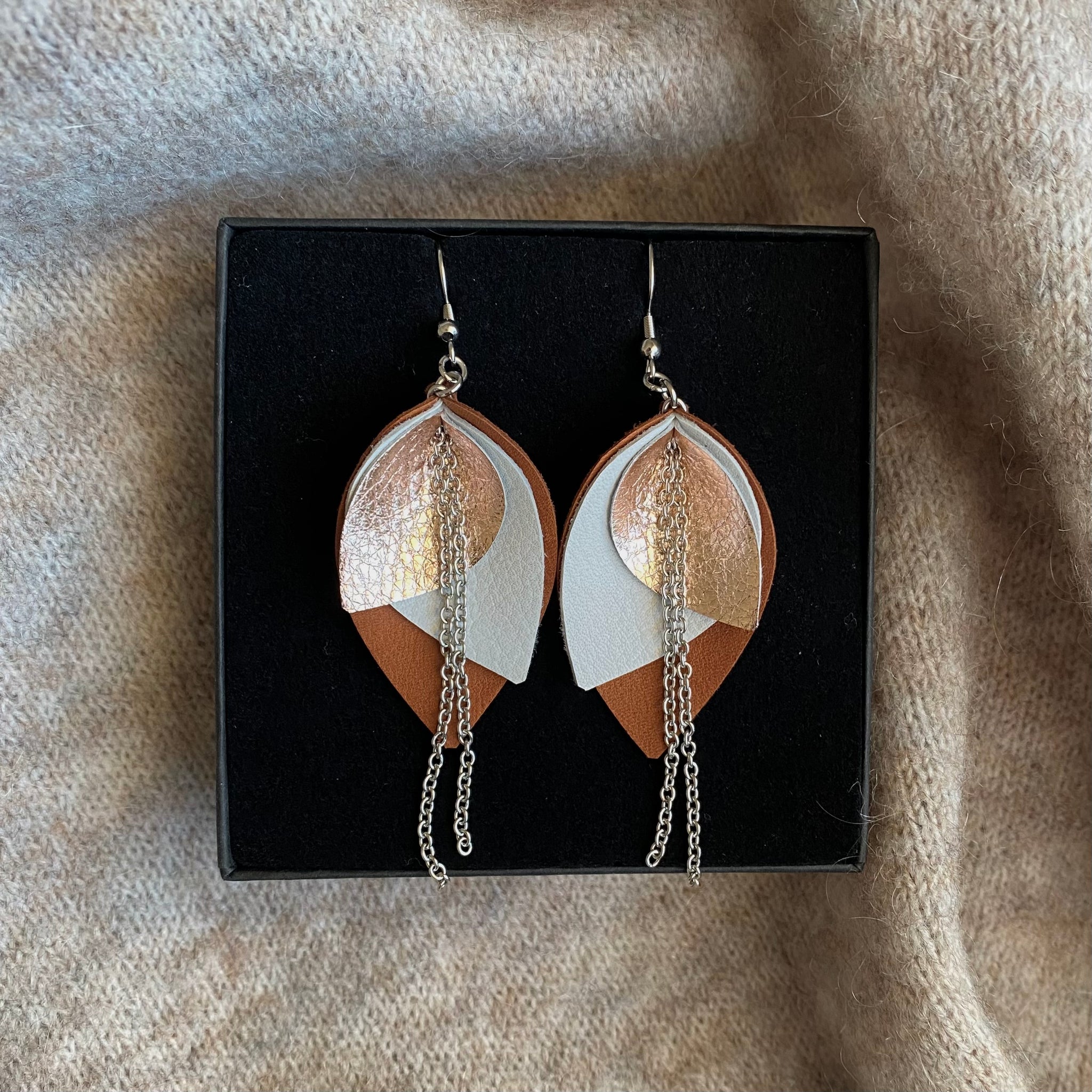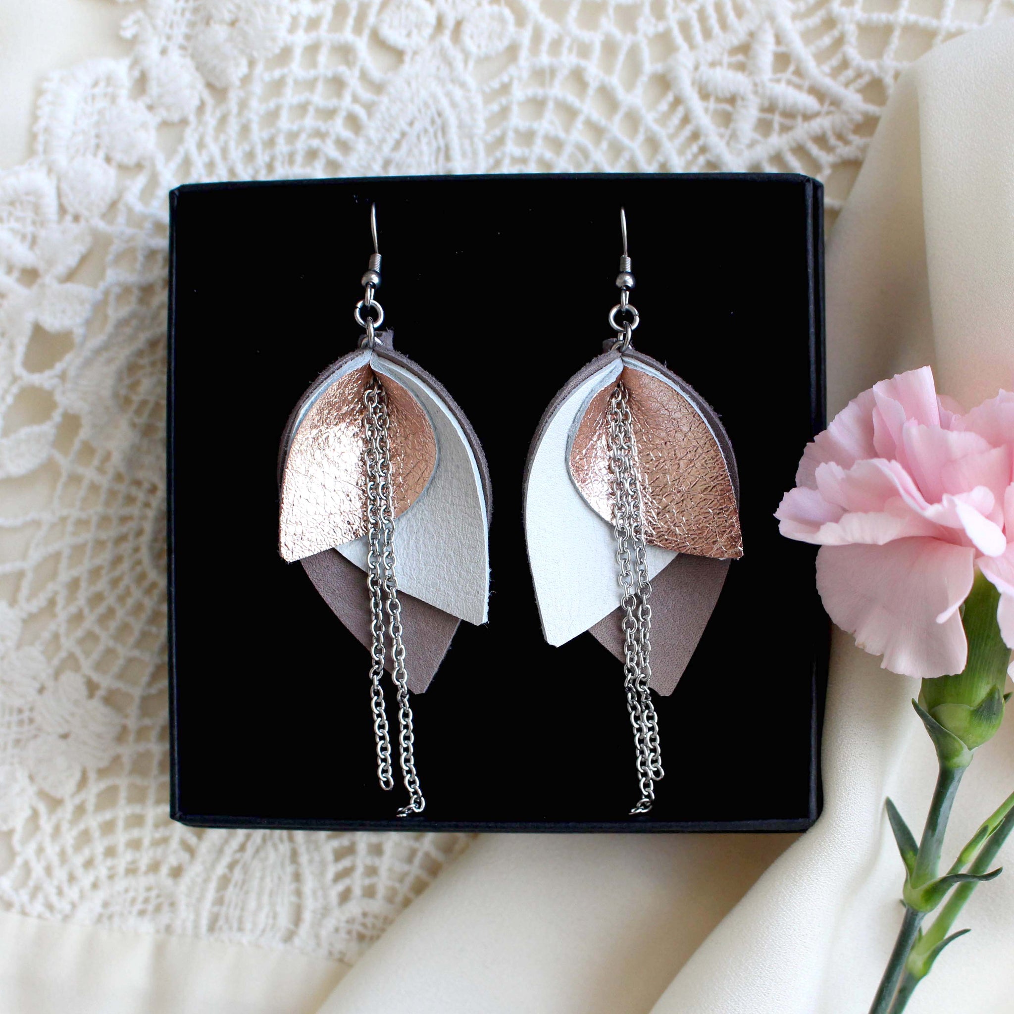 Iso Bloom-korvakoru koostuu kolmesta väristä: kahdesta pääväristä ja metallipintaisesta nahasta, joka on joko hopea tai ruusukulta.