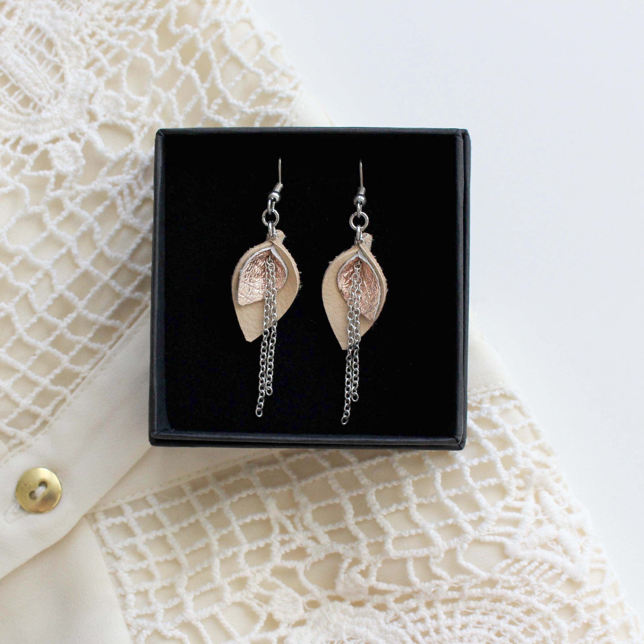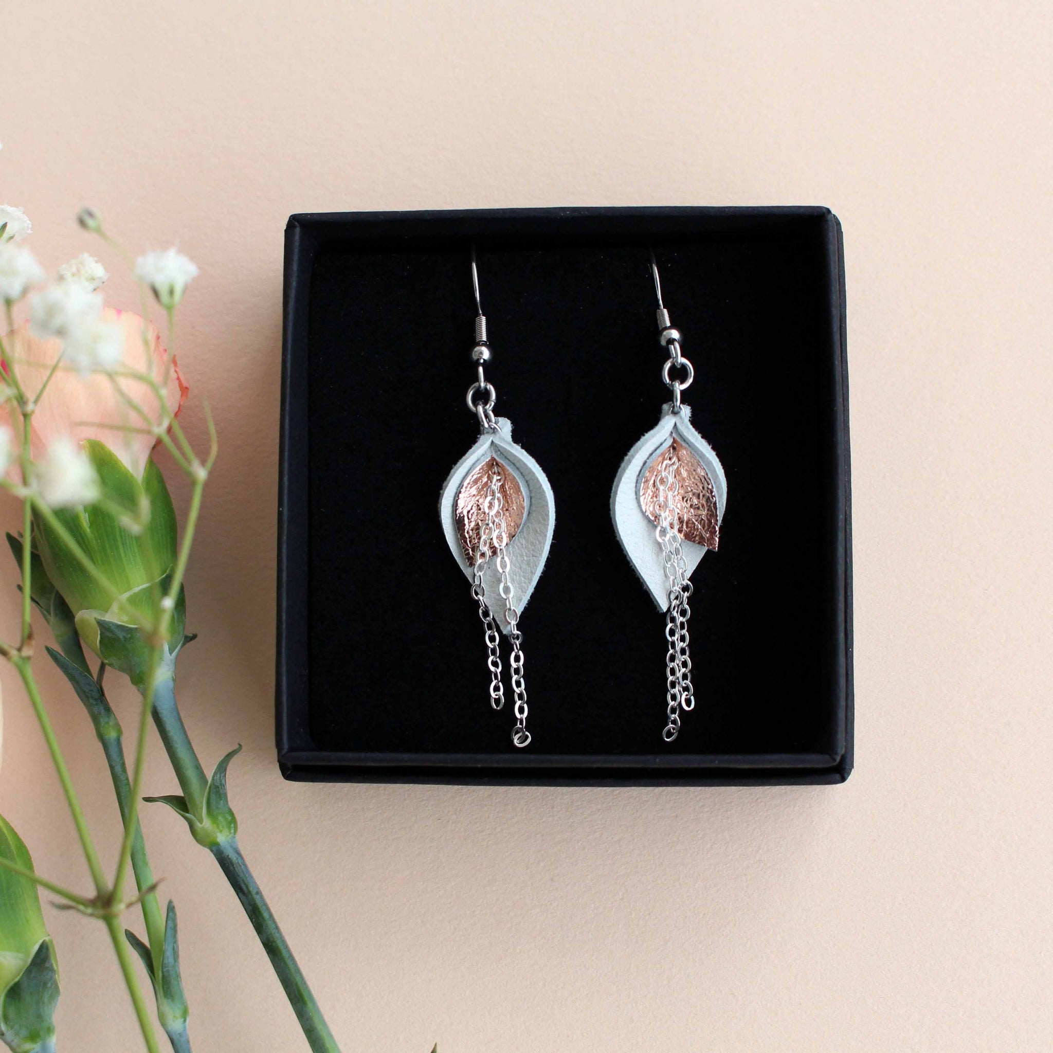 Mini Bloom-korvakoru koostuu kahdesta väristä: pääväristä ja metallipintaisesta nahasta, joka on joko hopea tai ruusukulta.