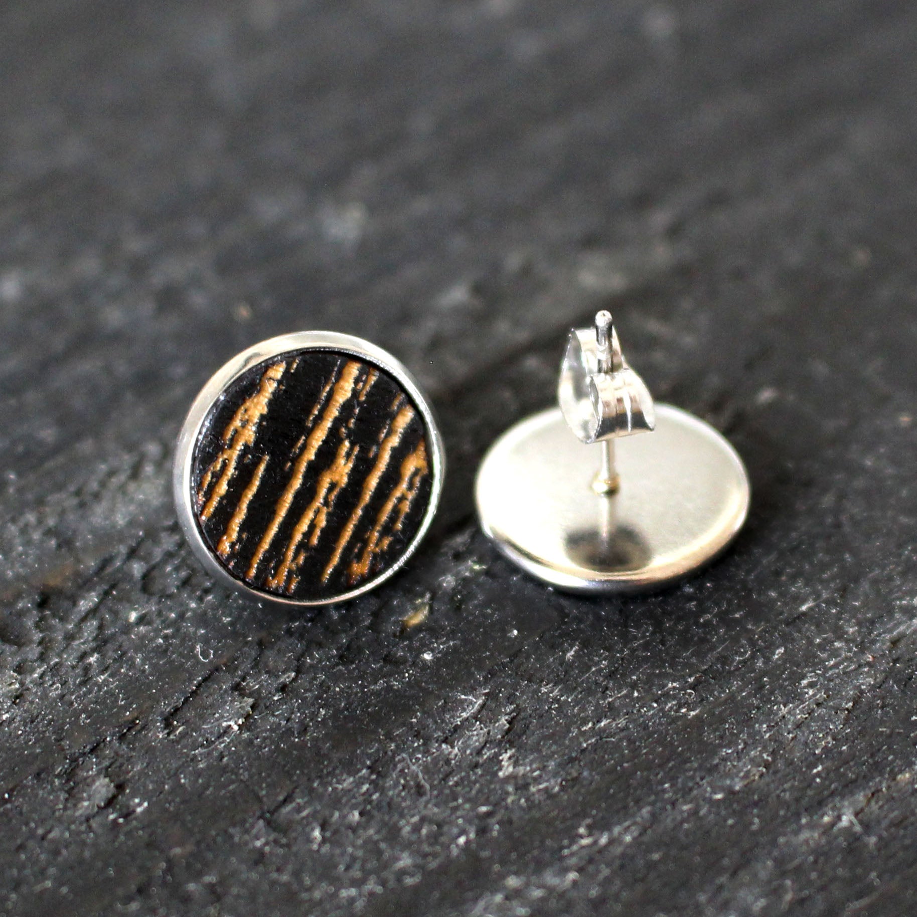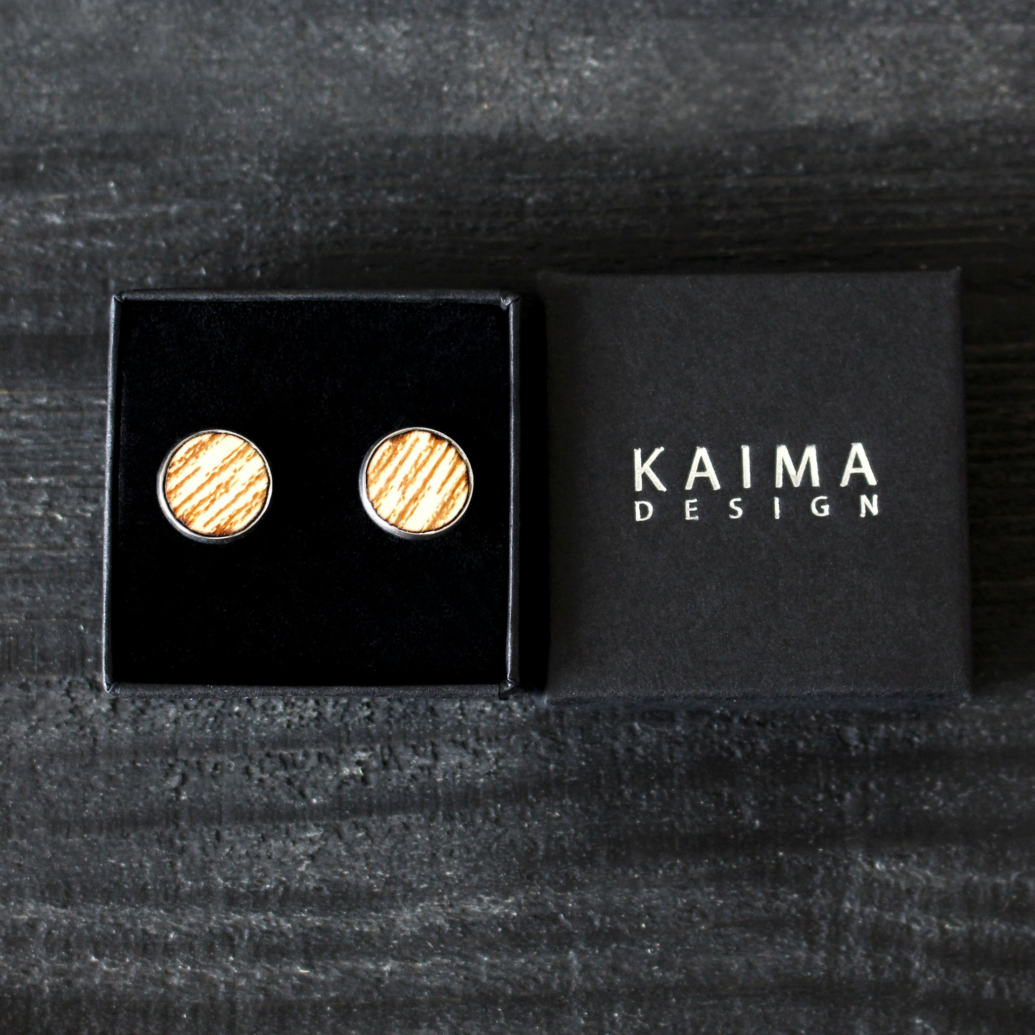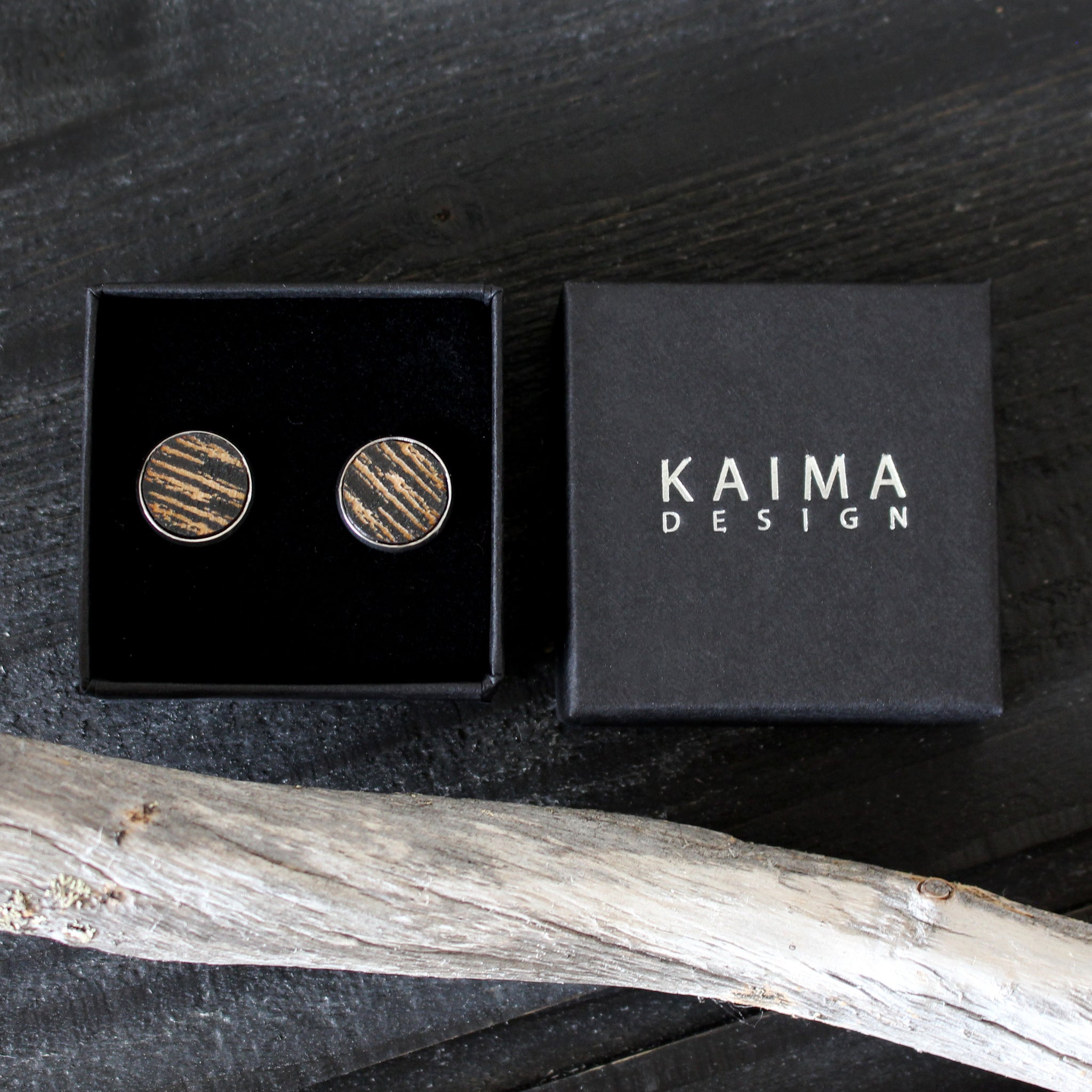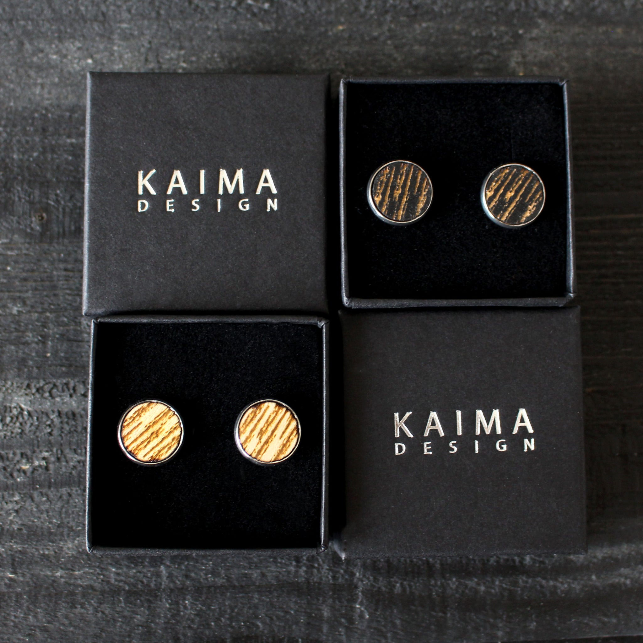 Kelo -malliston isot nappikorvakorut, väreissä puu ja musta.