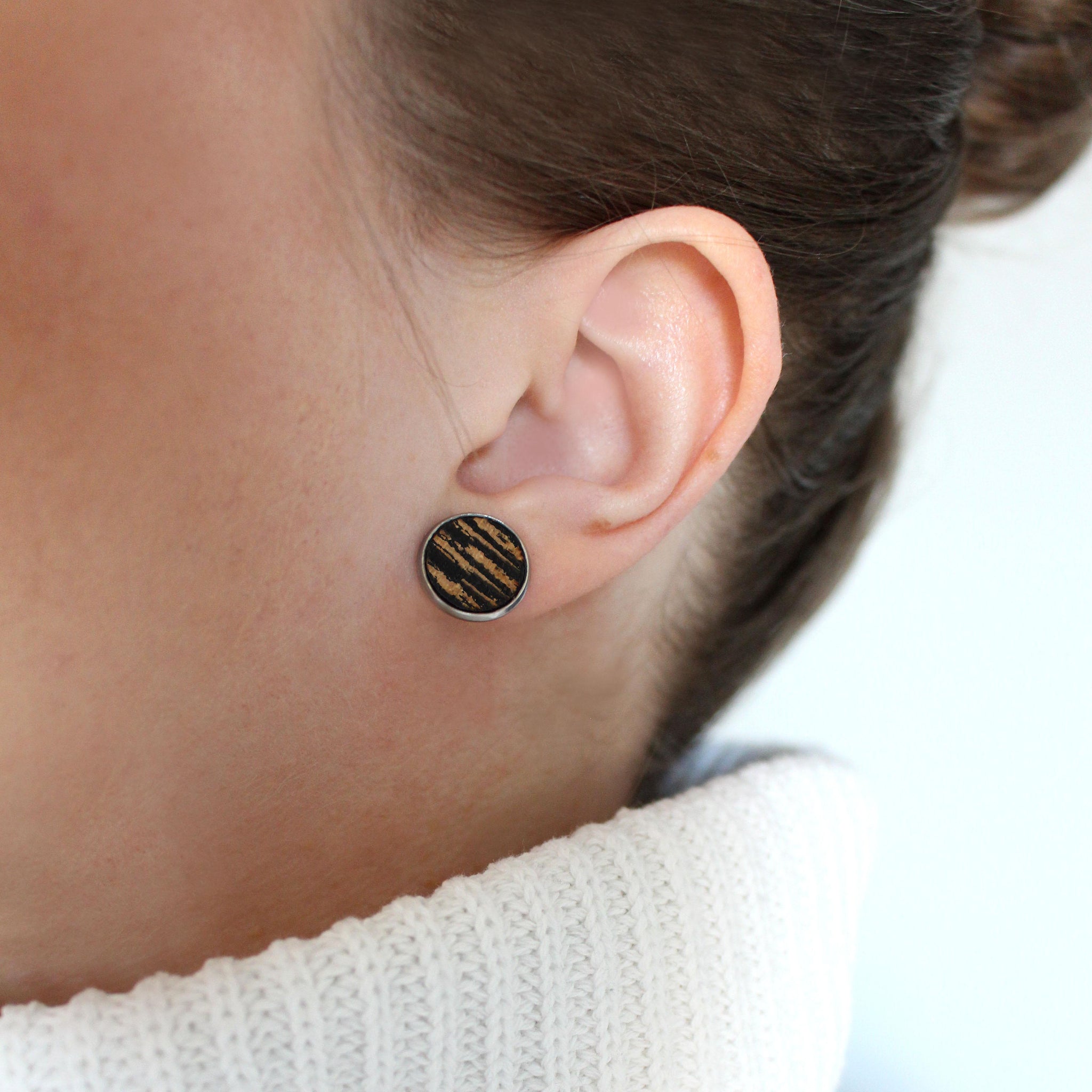 Lähikuva tytöstä, jolla on korvassa Kelo-sarjan puun värinen iso nappikorvakoru.