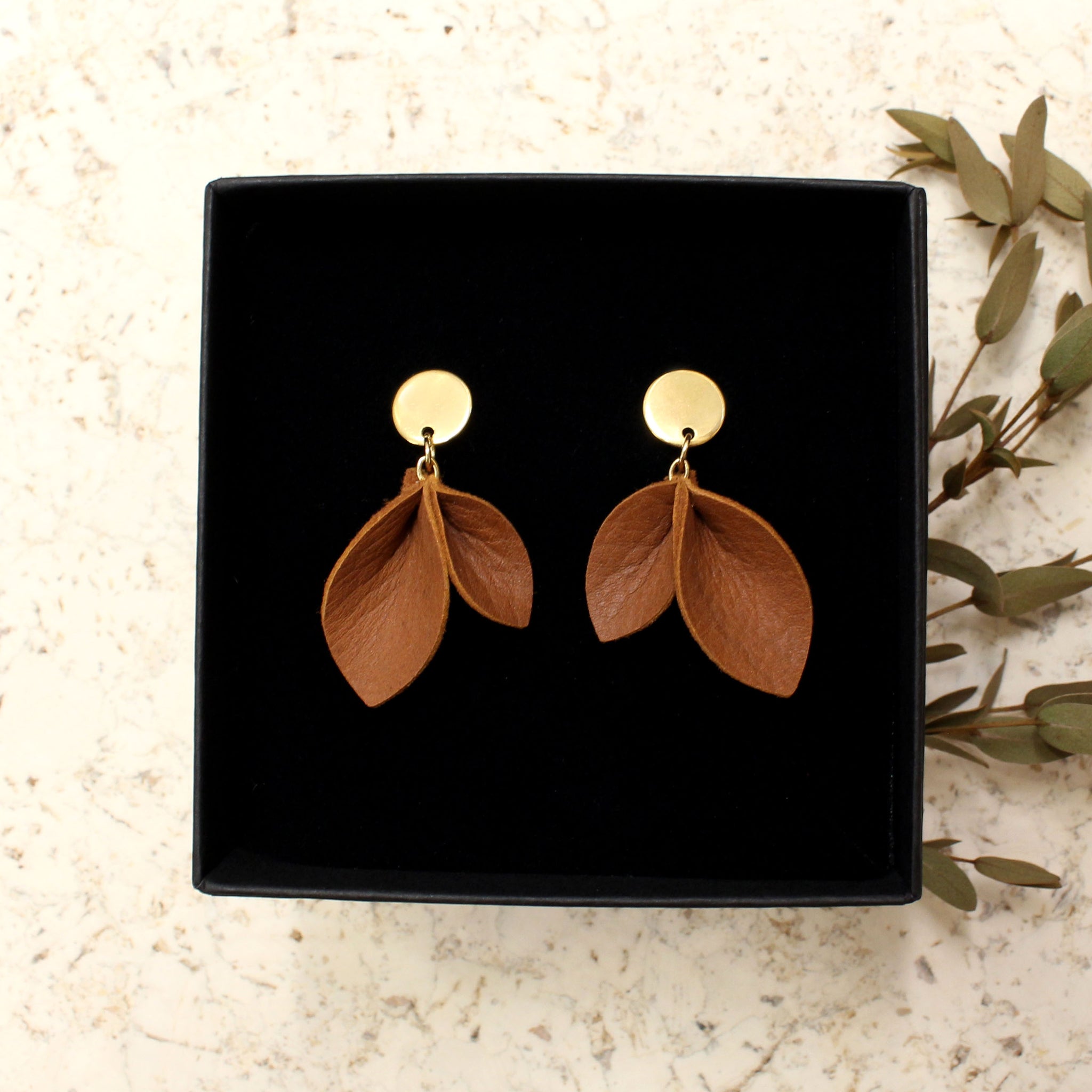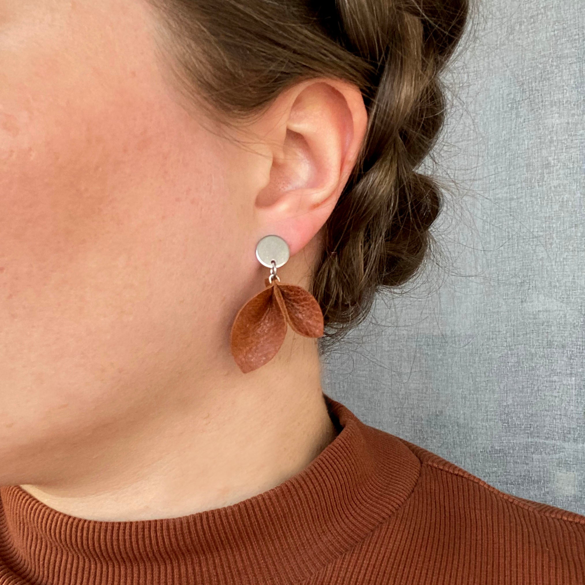 Materiaaleina kasviparkittu paksumpi poronnahka ja allergisoimaton ruostumaton teräs, jonka päällä kultainen pinnoite. Korun koko on 3x4 cm. Poronnahka on paksumpaa ja sen käsittelyn myötä siinä näkyy enemmän elämän jälki sekä luonnollinen materiaalin pinnan vaihtelu. Huomioithan, että tuotteiden pinta voi tämän vuoksi erota hiukan toisistaan antaen jokaiseen samalla uniikin säväyksen.